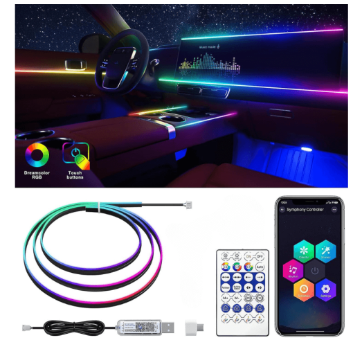 Διακοσμητική λωρίδα φωτισμού LED RGB για καμπίνα αυτοκινήτου με εύκολη εγκατάσταση και έλεγχο μέσω τηλεχειριστηρίου.